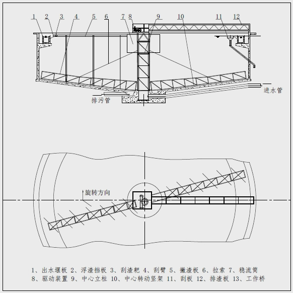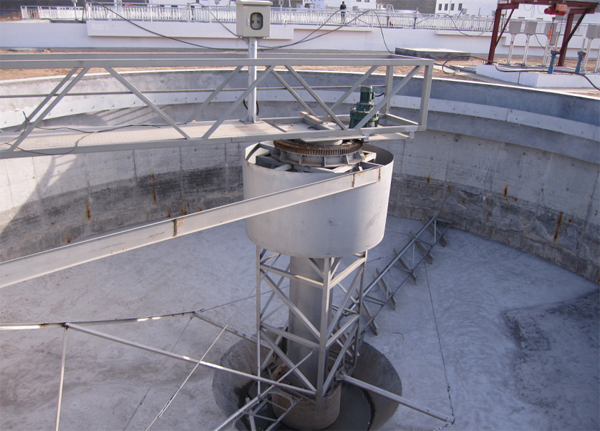 用途及簡介: CG垂架式中心傳動刮泥機適用于中心進水、周邊出水、中心排泥的重、大型池徑的輻流式沉淀池,主要用于城鎮(zhèn)污水處理廠二次沉淀池的排泥。 結(jié)構(gòu)和工作原理: CG垂架式中心傳動刮泥機主要由工作橋、中心驅(qū)動裝置、中心旋轉(zhuǎn)豎掛、刮臂、中間拉桿、拉筋、導(dǎo)流筒及撇渣排渣等部件組成。 該設(shè)備采用中心傳動、垂架式,污水從進水管流入導(dǎo)流筒擴散后,均勻的向周邊呈輻射狀流出,呈懸浮狀的污泥經(jīng)沉淀后沉積于池底,驅(qū)動裝置帶動中心豎架旋轉(zhuǎn),并帶動刮臂及刮泥板轉(zhuǎn)動,將污泥從池周刮向中心集泥槽后,靠池內(nèi)靜水壓由排泥管排出池外。水面的浮渣通過撇渣裝置撇向池邊,再由刮渣耙刮進排渣斗內(nèi)排出池外。而上清液則通過出水堰板溢入出水槽內(nèi)排出。 電氣控制:可根據(jù)用戶需要設(shè)定設(shè)備的啟、停及運行時間,可帶PLC接口。