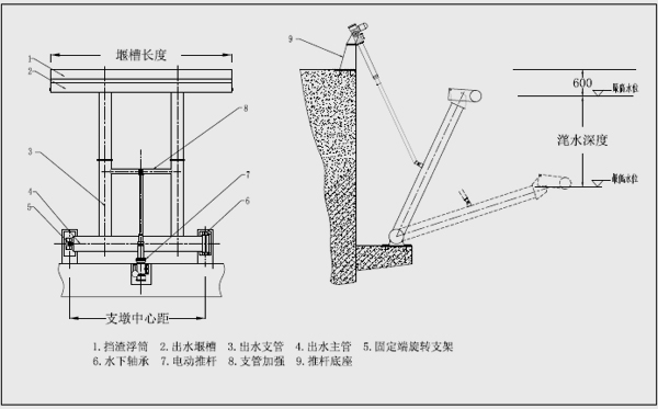 XB旋轉(zhuǎn)式潷水器主要由電控箱、電動推桿、潷水主管及支管、堰槽組件、浮筒組件、出水組件、行程控制、底座等部分組成。旋轉(zhuǎn)式潷水器由電動推桿把水下部分與執(zhí)行機構(gòu)連接起來,當需要排水時,中央控制系統(tǒng)會給出信號,指令電機驅(qū)動螺桿旋轉(zhuǎn),電動推桿向前推出,集水堰槽隨水平管的轉(zhuǎn)動而下降,開始潷水,排出的上清液由排水管排出,當潷水結(jié)束后,推桿內(nèi)計數(shù)器給出信號,電機反轉(zhuǎn),牽引集水堰槽上移,回到預置位置,等待完成下一個循環(huán)。